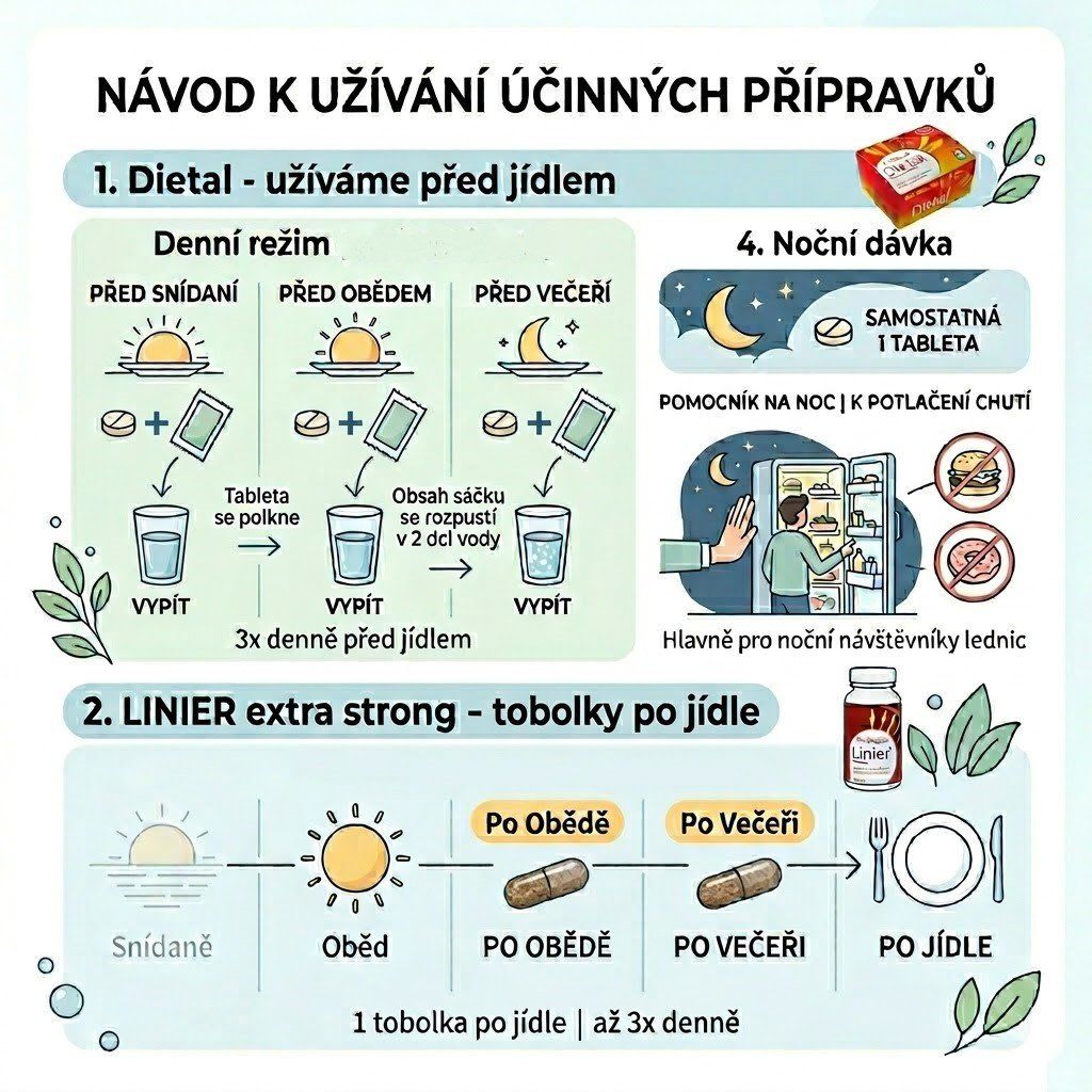 - večer lze užít 1 tabletu navíc - pro noční návštěvníky lednic na potlačení chutí