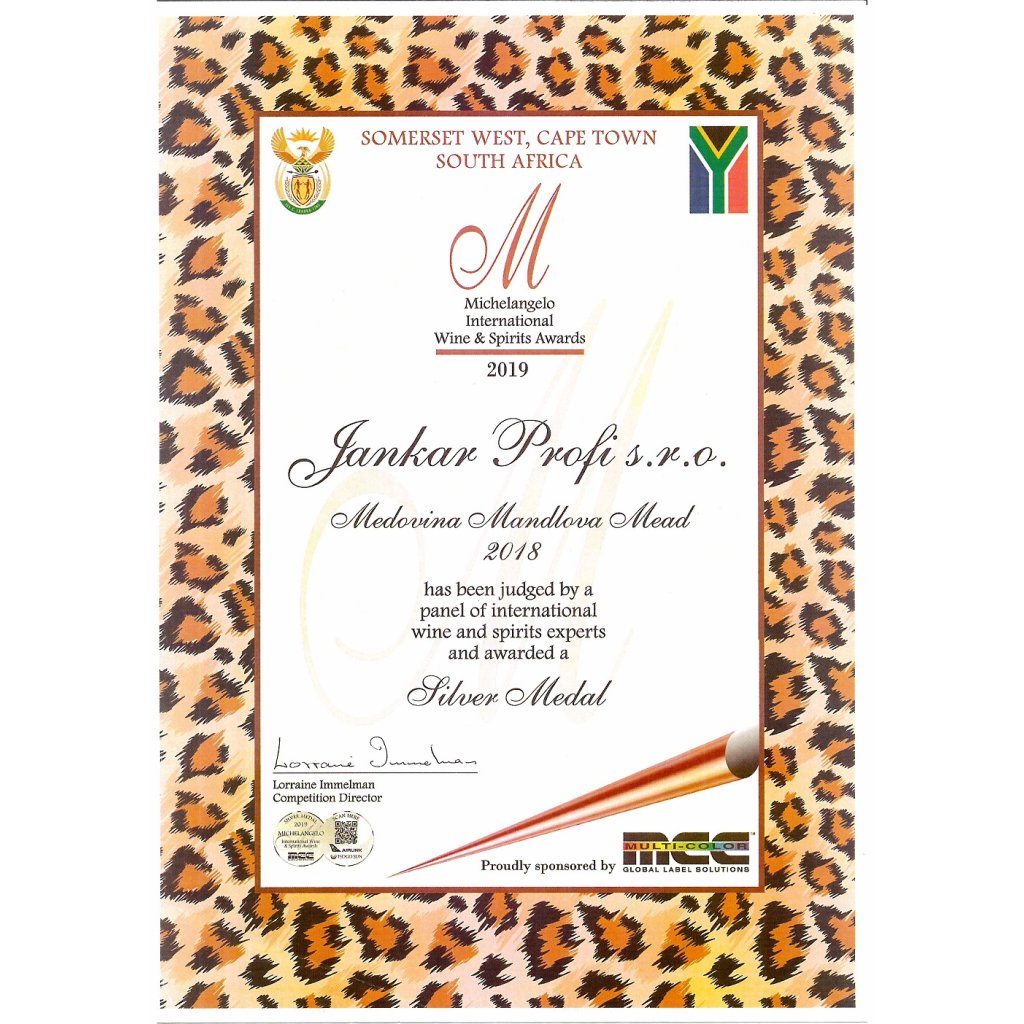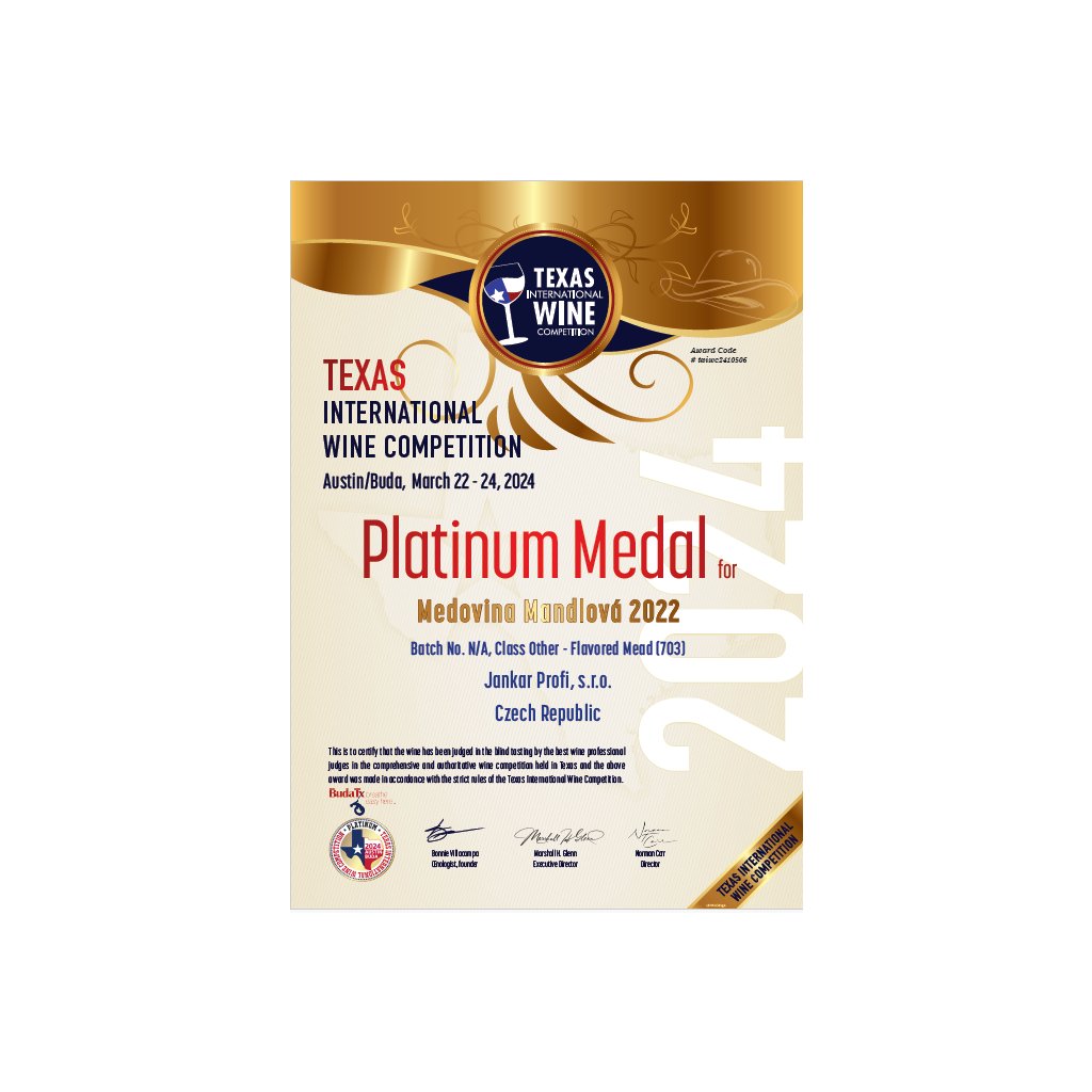 A právě v této prestižní konkurenci vynikla naše Mandlová medovina. Porota složená z expertů z 22 zemí a 7 kontinentů ocenila její výjimečnou kvalitu mezi více než 2000 vzorky z celého světa!