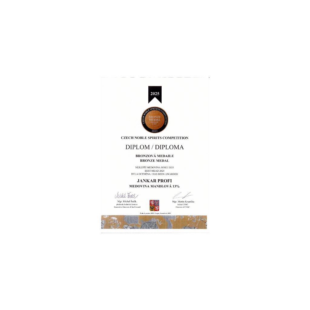 Ing. Karel Bojda, Ph.D., MBA z Čeladné není jen výrobce medoviny - je skutečný mistr svého řemesla. Při svém prvním velkém zahraničním startu okamžitě oslnil odbornou porotu a získal stříbrné medaile pro své medoviny Čeladenka a právě tuto Mandlovou.